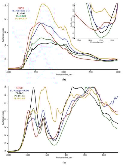 Diffuse reflectance mode, LN-MCT photovoltaic detector; nanodiamond brands: red, SDND; blue, PL-Nanopure GO1; black, PL-D-G; green, PL-D-G02; orange, PL-D-G01P; (a) 6000–4000 cm−1, (b) 4000–2000 cm−1 (c) 2000–800 cm−1 range. Spectra are smoothed (13 points) and normalized to maximize each spectrum.