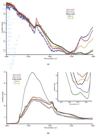 The near IR region shows two wide bands at 5900–5600 and 4300 cm−1 that are C–H first overtone and combination bands, respectively (Figure 1a). In some cases, a weak broad band at 4800 cm−1 that may be attributed to aromatic C–H combination bands is present. They are revealed by DRIFT and FTIR–PAS and not ATR. Additionally, these modalities show a rather explicit combination band of water at 5300 cm−1 with intensities correlated with the intensities of water bands in the mid-IR range.