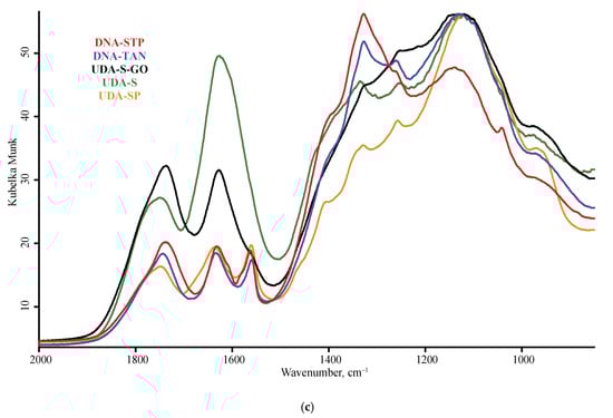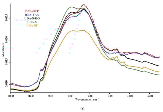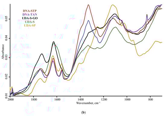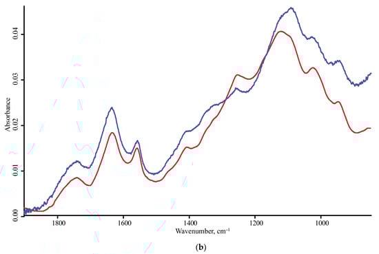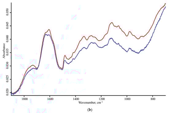 Despite most intense bands in the range of 1400–1200 cm−1, this is not well-resolved (Figure 1c and Figure 2c), most probably due to saturation effects [], and this range is not expedient for band comparison.