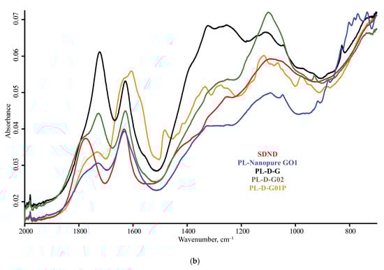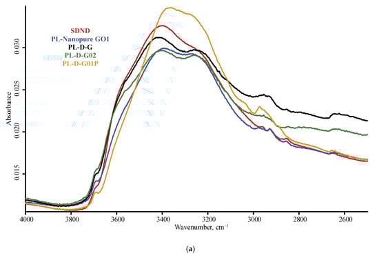 Thus, the region of 1500–900 cm−1 should be further taken into account as the selected unmodified ND brands did not allow for the final reliable information on the bands at 1470, 1440, 1400, 1370, 1330, 1270, 1210, 1190, 1140, 1100, 1050, 950 cm−1; this would require a more detailed study with samples with known functional groups and a cross-comparison with other nanoparticle materials different from nanodiamonds.