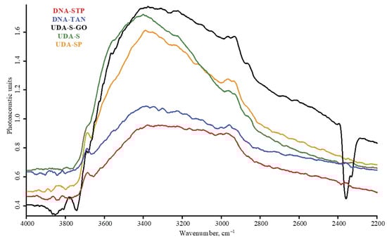 The H–O–H band at 1610 cm−1, to which we assign more tightly bound water is weaker than in FTIR–PAS and especially ATR. This allows for revealing actual bands belonging to asymmetric C=O and C=C stretches in this area (PL-D-G01P, UDA-S, UDA-SP, and DNA-STP).