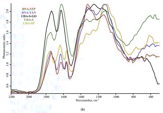 The carbonyl band at 1760 cm−1 is most intense in the range 1900–1300 cm−1 (Figure 1b and Figure 2b). The right shoulder band at 1790 cm−1 (conjugated carbonyl groups) is less pronounced compared to ATR and FTIR–PAS (DNA-TAN and DNA-STP brands).