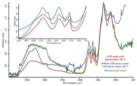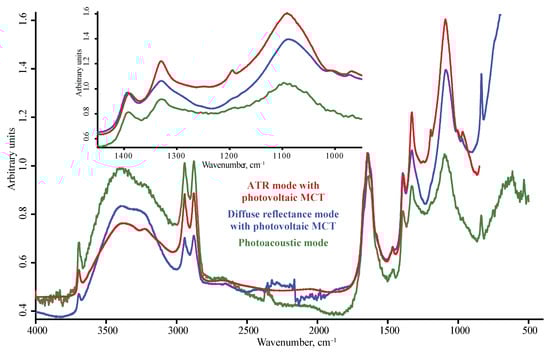 The FTIR–PAS spectra obtained by method 3 with an interferometer frequency of 1.6 kHz and an amplification of the signal of sample 1000 were smoothed over 25 points and the intensity was multiplied by []. The ATR spectra were additionally transformed as follows: I0a + b = Icorr, where I0 is the intensity of the ATR spectra after the operations described above, Icorr is the intensity of the ATR spectra for comparison with the FTIR–PAS spectra, a = 150, b = 1.