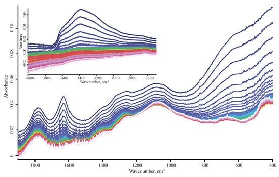 A band of H–O–H bending vibrations of liquid unbound or loosely bound water 1643 cm−1 is present in all the spectra; all the studied air-dried samples contain 5–7% of water [,]. Another band of water (1620–1635 cm−1) is present in all the spectra. Its wavenumber is red-shifted compared to liquid water (1643 cm−1), evidencing a high contribution of hydrogen-bonding to the vibrations []. Its intensity decreases after drying, but this band does not disappear even after five hours of drying, using ultra dry air at room temperature inside the DRIFT accessory (Figure A3, Appendix A). These bands almost disappeared at temperatures above 100 °C (Figure 7). The presence of this band is evidence of the water layer at the surface of the nanodiamonds that determines the colloidal solubility of nanodiamonds and its division into “soluble” and “insoluble” brands []. In this work, we used drying to confirm the correct assignment of water bands, especially at the 1700–1600 cm−1 region.