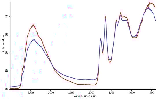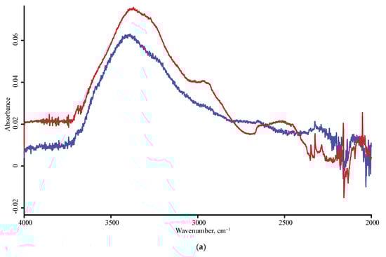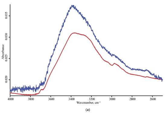 In the shortwave mid-IR region, a wide band of 3700–3000 cm−1 of O–H stretch and intermolecular hydrogen bonds [] and, at its shoulder, sharp bands at 3695 cm−1 of isolated water and 3569 cm−1 attributed to hydrogen-bon bonded water and non-water –OH groups are observed [,,]. These bands are present in DRIFT and FTIR–PAS and are not reliably detected with ATR (Figure 3 and Figure 4). Some brands show another sharp band at 3715 cm−1 that can be attributed to ROH···HOR hydrogen bonds.