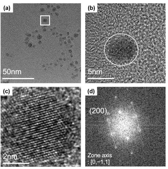 (a) TEM image of nanoparticles captured on the graphene membrane of the TEM Cu grid with a capture time of 10 s, (b) high resolution TEM (HR-TEM) image of the white square in (a), (c) a higher magnification of the nanoparticle in the white circle of (b,d) the fast Fourier transformation (FFT) image of (c).
