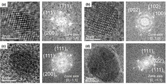 To characterize the phase of the nanoparticles, both d-spacings and lattice angles determined from the FFT image were compared with the reported values of carbon allotropes. The observed nanoparticles were classified into four carbon allotropes: i-carbon, hexagonal diamond, n-diamond, and cubic diamond, as shown in Figure 3, respectively. The nanoparticle in Figure 3a was captured for 10 s at 900 °C with a filament temperature at 2100 °C and gas mixture of 3% CH4-97% H2. The FFT image in Figure 3a shows the single-crystalline cubic phase diamond along the <110> zone axis. Vora et al. [18] analyzed an i-carbon film that contained an unknown cubic phase having a lattice parameter of 4.25 Å; they assigned d-spacings of 2.43 and 2.12 Å of the phase to the (111) and (200) planes, respectively. This phase is called i-carbon [19,20,21]; d-spacings of 2.42 and 2.10 Å of the nanoparticle in Figure 3a were assigned, respectively, to the (111) and (200) planes of the cubic phase with a lattice parameter 4.2 Å, which are nearly the same as the spacings reported by Vora et al. [18]. The observed i-carbon nanoparticles showed a d-spacing range of 2.36–2.54 Å. As a result, there was variation in the lattice parameter over the range of 4.1–4.4 Å. Additionally, the lattice angles of 70° and 54° shown in Figure 3a, which are between the two (111) planes and between the (111) and (200) planes, respectively, matched with those of i-carbon.