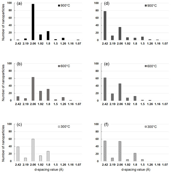 In Figure 4a, where the gas mixture was 1% CH4-99% H2, nanoparticles captured at 900 °C show the number of 97 for 2.06 Å and the number of 1 for 2.42 Å. In addition, in Figure 4c, nanoparticles captured at 300 °C showed the number of 39 for 2.42 Å and the number of 60 for 2.06 Å. However, in Figure 4d, where the gas mixture was 3% CH4-97% H2, nanoparticles captured at 900 °C show the number of 35 for 2.06 Å and the number of 78 for 2.42 Å. On the other hand, in Figure 4f, nanoparticles captured at 300 °C showed the number of 55 for 2.42 Å and the number of 54 for 2.06 Å. The number for 2.06 Å at 1% CH4-99% H2 in Figure 4a–c is higher than that at 3% CH4-97% H2 in Figure 4d–f at all capture temperatures.