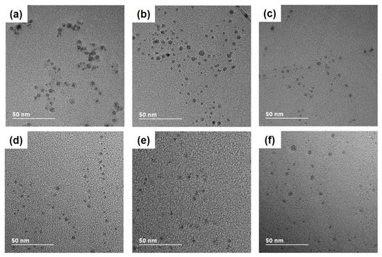 HR-TEM images of nanoparticles captured for 10 s using 1% CH4-99% H2 at (a) 900 °C, (b) 600 °C, (c) 300 °C and using 3% CH4-97% H2 at (d) 900 °C, (e) 600 °C, and (f) 300 °C.