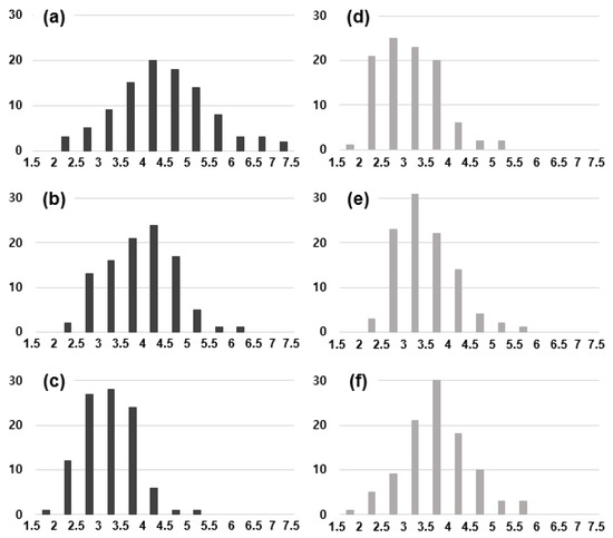 Figure 5 shows the TEM images of nanoparticles captured under six different conditions. Figure 5a–c show nanoparticles captured, respectively, at 900 °C, 600 °C and 300 °C at the gas mixture of 1% CH4-99% H2. These images show that the size of nanoparticles decreases with decreasing capturing temperature. On the other hand, Figure 5d–f show nanoparticles captured, respectively, at 900 °C, 600 °C and 300 °C at the gas mixture of 3% CH4-97% H2. These images show that the size of nanoparticles increases with decreasing capturing temperature. To make a more quantitative analysis of the size, the size distribution of nanoparticles was measured from the TEM image.