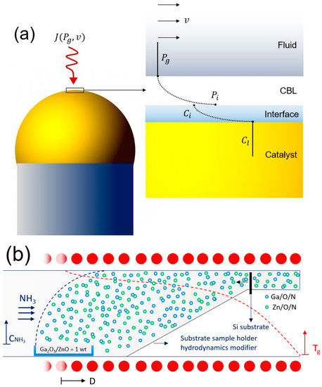 The gas mass-transfer flux ( J g ) of vapor phase deposition is a function of the overall gas transfer coefficient ( k g ) and the partial pressure difference   ( P g P i ) , which can be expressed as J g = k g · ( P g P i ) . To maintain stable growth, chemical vapor deposition (CVD) synthesis is conventionally operated in the laminar regime [23]. The partial pressure of precursors ( P g ) is sufficiently high in the neighboring regions of the source materials; however, it decays substantially in the vicinity of the catalyst and the fluid–catalyst interface ( P i ), due to the low mixing characteristics of the laminar flow, which are correlated to the thickness of the boundary layer. Further, as demonstrated in Figure 1a, the low velocity of fluid at the growth region creates a relatively thick concentration boundary layer (CBL), resulting in a low transfer coefficient ( k g ) that is inversely correlated to the thickness of the boundary layer, significantly reducing the partial pressure of reactants at the fluid-catalyst interface and, accordingly, their equilibrium concentration (Ci). Therefore, the catalyst–reactants’ alloy composition concentration (Cl), which is the driving force of primary nucleation and growth, is substantially decreased. As a result, the gas diffusion flux of gaseous products becomes too low to support stable epitaxial growth, and synthesis of an oxynitride thin film is not realized.
