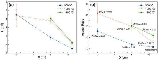 Figure 4. Dimensions of synthesized GaN:ZnO nanowires. (a) Length and (b) aspect ratios of the nanowires prepared at various source temperatures, set to 900 °C to 1100 °C, and locations (D) downstream of the Ga2O3 and ZnO source materials. Error bars represent a 90% confidence interval. Uniform coverage was not realized at Ts = 900 °C for 60 min at D = 13 cm; thus, the results are presented based on a few available nanowires observed in the study region.
