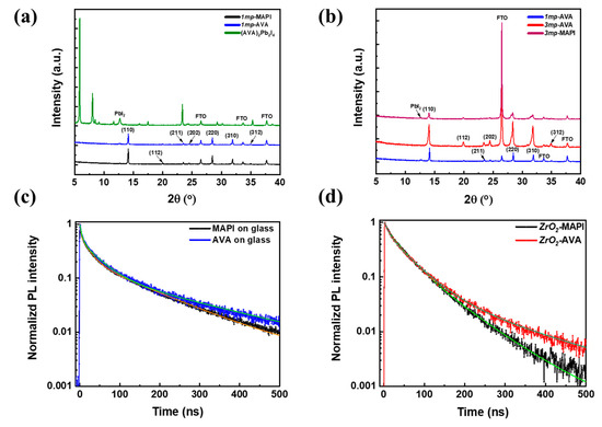 (a) XRD patterns of MAPI, AVA-MAPI, and (AVA)2PbI4 perovskite layers deposited on the 1mp substrate. (b) XRD patterns of 3mp-MAPI and AVA-MAPI layers deposited on 1mp and 3mp substrates. (c) TRPL of 1mp-MAPI and 1mp-AVA layers deposited on glass substrate. (d) TRPL of MAPI and AVA-MAPI layers deposited on mesoporous ZrO2/glass.