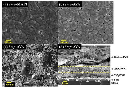 The surface morphology of the films was characterized by scanning electron microscopy (SEM). Top views in Figure 3 show that the 1mp layer was filled and capped by the PVK material. The capping PVK layer presented fewer pinholes for MAPI compared to AVA-MAPI. The average grain size was measured at 320 nm for MAPI and 330 nm for AVA-MAPI. The top aspect was different in the case of the 3mp substrate (Figure 3c). We observed mesoscopic carbon and graphite flakes. AVA-MAPI filled the mesoporous layers stack, and the top layer was not capped by the PVK material. Figure 3d is a cross-sectional view of the 3mp-cell where one can recognize the triple mesoporous stack which contains the PVK as schematized in Figure 1b.
