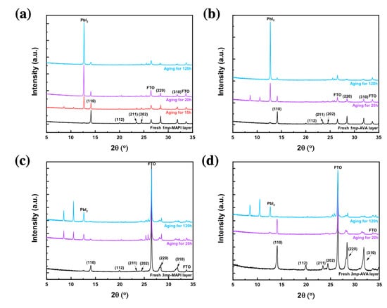 XRD pattern evolution of (a) 1mp-MAPI, (b) 1mp-AVA, (c) 3mp-MAPI, and (d) 3mp-AVA layers upon aging in a 90% RH atmosphere.