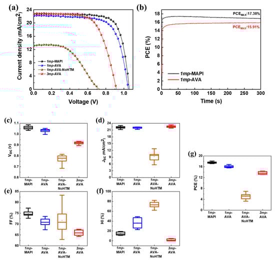 (a) Reverse scan J-V curves of 1mp-MAPI, 1mp-AVA, 1mp-AVA-NoHTM, and 3mp-AVA solar cells. (b) Tracking curves of 1mp-MAPI and 1mp-AVA best cells. (c–g) Statistical analysis of the solar cells J-V curve parameters: (c) Voc, (d) Jsc, (e) FF, (f) HI and (g) PCE.