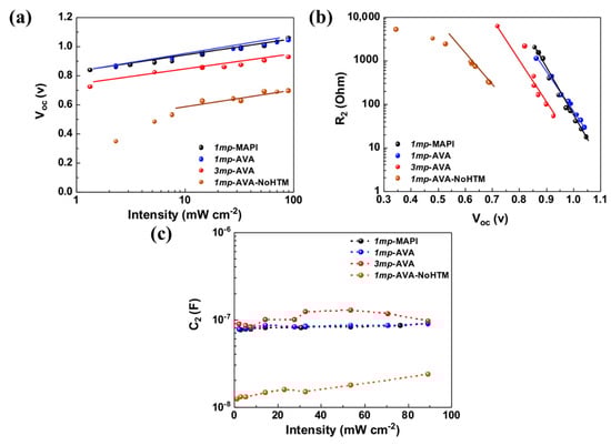 (a) Open-circuit voltage (Voc) versus light intensity (power density) curves. (b) Variation of R2 versus Voc. (c) C2 versus light intensity.