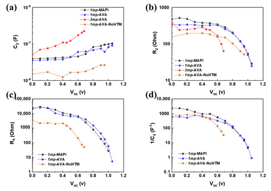 C2 is presented in Figure 7a. The 1mp-MAPI and 1mp-AVA cells have similar behavior. At low applied voltage, C2 is assigned to the dielectric intrinsic capacitance of the PVK layer. Introducing AVA does not change the permittivity of the layer significantly. The fact that C2 is unchanged over a large Vappl in the 3mp device suggests that C2 is a dielectric intrinsic capacitance of MAPI-AVA material filling the pores. Higher and increasing C2 values are found for the 1mp-AVA-NoHTM cell, which suggest several contributions for this electrical component.