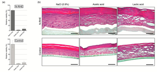 In vitro evaluation of skin corrosion of N-RHE and epidermal control (USP-RHE): (a) Viability, according to OECD TG 431. Results are expressed as mean ± standard deviation of two independent experiments (n = 2), each tested with three different tissue replicates; (b) Histological analysis of H&E stained vertical paraffin sections. Results were obtained after exposure to substances: NaCl (0.9%), acetic acid, and lactic acid. Bar = 50 µm.