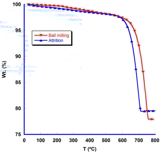 TGA analysis performed on the different dry precursors provides information about their weight evolution with temperature, giving information about the decomposition and phase formation processes, as shown in Figure 1. As it can be easily observed in the graph, weight loss starts at a significant lower temperature for the attrition-milled precursors than for the ball-milled ones. Moreover, at high temperatures, ball-milled precursors lost more weight than the attrition ones. This effect can be explained taking into account the following reactions occurring during the thermal treatments: