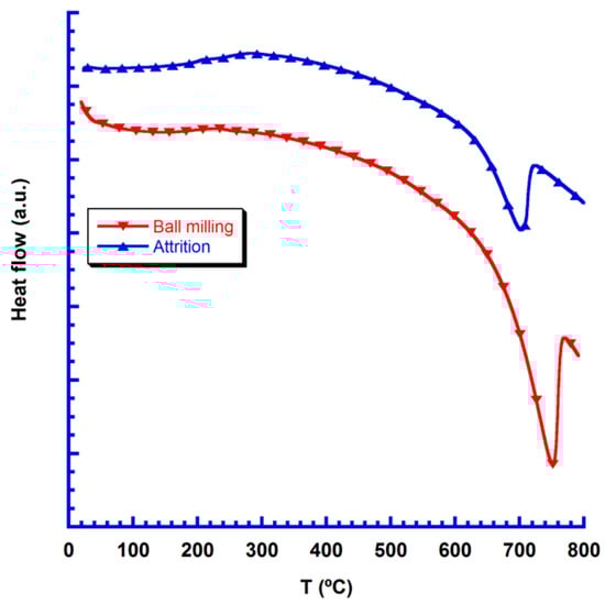 DTA and TGA analyses have been simultaneously performed to evaluate the sign and magnitude of heat flow in the processes observed in the TGA graph. The sample evolution with temperature observed in the TGA analysis are confirmed through the DTA results displayed in Figure 2. In this plot, it can be easily observed that the endothermic peak appears at lower temperatures for the attrition-milled precursors. Consequently, the decomposition step of Ca carbonate is starting about 50–75 °C lower temperatures for the attrition-milled precursors, when compared to the ball-milled ones. Moreover, the heat flow is much lower in the attrition-milled precursors, pointing out to the lower CaCO3 decomposition energy, due to their much smaller particle sizes.