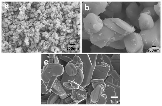 Representative FESEM micrographs obtained on (a) as-milled attrition powders; (b) attrition-milled powders after calcination at 850 °C for 1 h; (c) ball-milled powders after calcination at 750 °C for 12 h + 800 °C for 12 h.