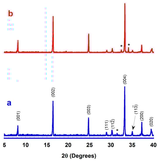 Representative XRD patterns performed on the surface of sintered samples are displayed in Figure 4. As it can be observed in the plot, most of the peaks are associated to the thermoelectric Ca3Co4O9+δ phase, in agreement with previous studies [11]. Moreover, the most intense ones are assigned to the (00l) reflection planes, indicating a possible slight grain orientation, at least in the surface, due to the applied pressure during the ceramic conformation, as previously reported [12]. On the other hand, only minor peaks (indicated by *) belonging to the Ca3Co2O6+δ phase [11] can be found, indicating that this phase is in very small proportion in all samples.