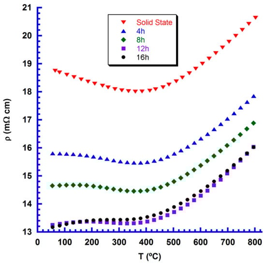 The evolution of electrical resistivity with temperature for all samples is shown in Figure 6. As it can be observed in the plot, all the samples show very similar evolution in the whole measured temperature range, in agreement with previously published results [20]. They show semiconducting behaviour from room temperature to around 400 °C, indicating hole hopping conduction from Co4+ to Co3+ [21] and metallic ones at higher temperatures. On the other hand, the use of attrition-milled precursors, with much smaller particle sizes and higher reactivity, probably lead to higher electrical conducting grain boundaries, explaining the lower electrical resistivity in these samples. Moreover, when increasing sintering time up to 12 h in these samples, electrical resistivity is further decreased, while it is maintained constant for longer sintering times. The minimum values determined at 800 °C (16 mΩ cm) in samples sintered for 12 h is about 25% lower than those measured in samples produced through the ceramic route in this work (20.6 mΩ cm) or previously published results (20–41.7 mΩ cm) [20,22,23]. Furthermore, they are similar to those reported in samples produced using solution methods (about 16 mΩ cm) [24] or by directional solidification (around 15 mΩ.cm) [25]. On the other hand, they are much higher than those obtained in textured materials produced by spark plasma sintering and measured along the ab-plane (6–8 mΩ.cm) [26,27,28]. It is worth mentioning that these textured materials show very high densities (>90% of the theoretical) and present very good grain alignment, explaining their very low electrical resistivity.