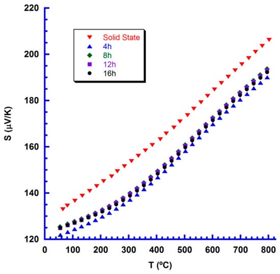 Figure 7 displays the variation of the Seebeck coefficient as a function of temperature for all samples. As it can be seen in the graph, S is positive in the whole temperature range for all samples, indicating a hole-dominating conduction mechanism. Moreover, samples produced through attrition milling show lower S values than the obtained in the ones prepared through the classical ceramic route, in agreement with the higher resistivity of these last samples. Furthermore, in spite of a slightly lower S values determined in samples sintered for 4 h, all the specimens produced from attrition-milled precursors display the same S values in the measured temperature range, which indicates that no changes in phase or oxygen content are produced after 8 h sintering. The highest value at 800 °C in these samples (~195 μV/K) is higher than the reported in spark plasma sintered samples (170–175 μV/K) [26], but slightly lower than the determined in laser floating zone grown materials (~205 μV/K) [25], which induces higher oxygen vacancies in the thermoelectric phase. Furthermore, they are in the order of those published for classically sintered materials (170–210 μV/K) [22,23].