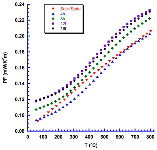 PF variation with temperature has been calculated for all samples, and the results are presented in Figure 8. From the data shown in this graph, it is clear that samples that sintered for 4 h show the same performances than those obtained in the classically produced ones. Moreover, when increasing sintering duration, their performances are raised up to 12 h and maintained constant for larger sintering times. The highest PF values at 800 °C (~0.23 mW/K2m), obtained in samples sintered for 12 h, are about 10% higher than the obtained through the classical ceramic route in this work, or in the literature (0.10–0.20 mW/K2m) [22,23]. On the other hand, they are much lower than the reported for textured materials produced by spark plasma texturing [26], or laser floating zone technique (~0.40 mW/K2m) [25]. In spite of these large differences, the samples produced in this work have been obtained through a very simple, economic, scalable, and environmentally friendly process, which may warrant their application in high-temperature thermoelectric modules.
