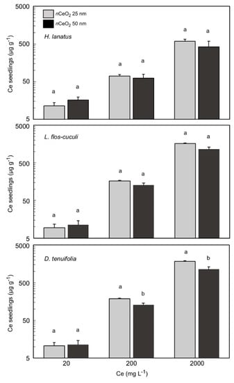 To quantify the total content of Ce that was taken up by seedlings in the three plant species, we used an ICP–MS after the acid digestion of the samples. The elaborated data with the total concentration of Ce are presented in Figure 5.