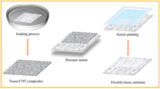 Material Preparation: Aqueous dispersion of CNTs was purchased from XFNANO (Nanjing, China) for conductive materials. Clean and soft tissue (Figure S1a) was used as flexible substrates and the backbone of sensitive layers. Conductive sliver paste was used as bottom electrodes. Additionally, VHB film (3M VHB Tape 4910, St. Paul, MN, USA) was used to assemble the sensor.