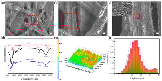 Composition characterization of the all-tissue-based pressure sensor. (a,b) Surface morphology of tissue/CNT composites. (c) Adhesion of CNTs to a single fiber. (d) FTIR results of CNT, tissue, and tissue/CNT composites. (e) 3D surface profile of tissue/CNT composites. (f) The proportion distribution of the surface roughness.