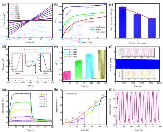 Pressure sensing and electrothermal converting of all-tissue-based electronics. (a) Current-voltage (I−V) curves of the sensor with various applied pressures. (b) Relative current changes and sensitivity of the sensor. (c) Sheet resistance of various tissue layers. (d) Response times (rise time and decay time) of the sensor. (e) Current-time (I–t) curves of the sensor under serial continuous pressure changes. (f) The durability test of the sensor in a pressure range of 1–2 kPa. (g) Time-dependent temperature variation with applied voltage. (h) Temperature profiles under a stepwise voltage from 1–6 V. (i) Temperature–time curve under a 5 V input voltage for 10 cycles.