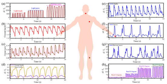 Generally, it is imperative to maintain the close contact between the pressure sensor and the human skin for subtle monitoring, and the pre-force that exists has almost no effect on the signal acquisition, so the sensor is attached to the corresponding body parts with the aid of a biocompatible woundplast. As presented in Figure 4a–h, the sensor can be installed in various parts of the human body, such as the finger, joints, chest, and throat, indicating a perfect interaction with the human skin. By touching the sensor with different finger forces (Figure 4a), the results showed significant relative changes, whether gently touched or pressed, which facilitates the integration into human skin to distinguish external force information in real time. Joint motion is also detectable, such as knee bending angle. Knee bending tests of 10, 30, 60, and 90 degrees were conducted (Figure 4h), and high current stability was realized by bending the sensor at different angles so that it is highly robust to monitor frequent human motion.