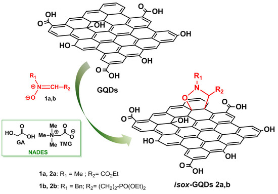 Due to their outstanding physicochemical properties, the next generation of the graphene family—graphene quantum dots (GQDs)—are at the cutting edge of nanotechnology development. GQDs generally possess many hydrophilic functionalities which allow their dispersibility in water but, on the other hand, could interfere with reactions that are mainly performed in organic solvents, as for cycloaddition reactions. We investigated the 1,3-dipolar cycloaddition (1,3-DCA) reactions of the C-ethoxycarbonyl N-methyl nitrone 1a and the newly synthesized C-diethoxyphosphorylpropilidene N-benzyl nitrone 1b with the surface of GQDs, affording the isoxazolidine cycloadducts isox-GQDs 2a and isox-GQDs 2b. Reactions were performed in mild and eco-friendly conditions, through the use of a natural deep eutectic solvent (NADES), free of chloride or any metal ions in its composition, and formed by the zwitterionic trimethylglycine as the -bond acceptor, and glycolic acid as the hydrogen-bond donor. The results reported in this study have for the first time proved the possibility of performing cycloaddition reactions directly to the p-cloud of the GQDs surface. The use of DES for the cycloaddition reactions on GQDs, other than to improve the solubility of reactants, has been shown to bring additional advantages because of the great affinity of these green solvents with aromatic systems.