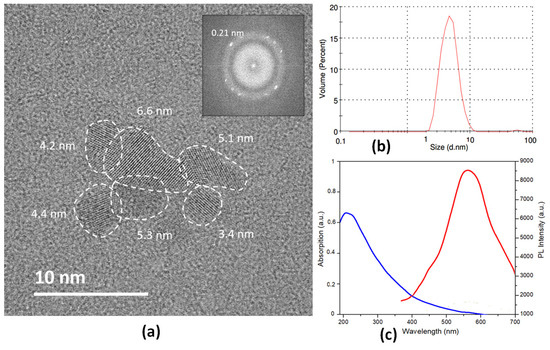 (a) Representative HRTEM image of a GQDs cluster with mean particle size of 4.8 nm and the corresponding fast Fourier transform (FTT) on the inset showing planes at 0.21 nm; (b) DLS measurement of GQDs dispersion in deionized water; (c) optical properties of GQDs dispersions in deionized water: UV—vis absorption spectrum of GQDs (blue line) and photoluminescence (PL) spectrum of GQDs at the excitation wavelengths of 360 nm (red line).