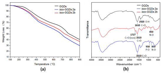 (a) TGA curves of GQDs, isox-GQDs 2a and isox-GQDs 2b, performed in Ar atmosphere; (b) FTIR spectra of GQDs, isox-GQDs 2a and isox-GQDs 2b.