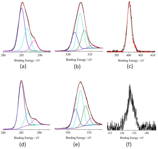 Al-Kα excited XPS of: (a,b) isox-GQDs 2a in the C 1s and O 1s binding energy regions; (c) overlapped XPS of the isox-GQDs 2b (black line) and isox-GQDs 2a (red line) in the N 1s binding energy region; (d,e) isox-GQDs 2b in the C 1s and O 1s binding energy regions; (f) isox-GQDs 2b in the P 2p binding energy region.