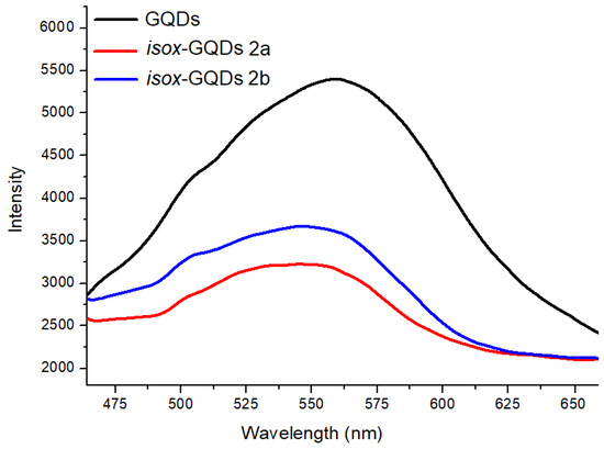The surface modification of GQDs was also investigated by comparing the PL properties of the starting nanomaterials with those of the corresponding cycloadducts in deionized water at the excitation wavelength of 360 nm (Figure 5). The PL λmax of GQDs, isox-GQDs 2a and isox-GQDs 2b were about 560, 545, and 550 nm, respectively. These blue-shifted emissions can prove that organic moieties are covalently bound with GQDs, as also reported for similar systems [48].