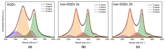 The study of the Raman spectrum is very useful for understanding the disordered graphitic materials [49]. Figure 6 shows the best fit of the Raman spectra of the GQDs and of isox-GQDs 2a and isox-GQDs 2b. The D- and G- bands dominate all spectra. The D-band is due to the breathing mode of aromatic rings in the carbon network and is related to the phonons of A1g symmetry at the K point of the Brillouin zone and it is disorder-activated [50,51]. The G-band is considered as the Raman fingerprint of the graphitic crystalline arrangements, and it is originated from the E2g symmetry stretching of all sp2 bonded C=C pairs [50,51]. Since the D-band progressively intensifies (relative to the G-band) with the increasing deviation from the perfect hexagonally-organized planar carbon network, the ID/IG ratio is commonly used to evaluate the presence of disorder in sp2 hybridized carbon systems [52,53]. The fitting procedure of the Raman spectra underlines the structural variations of samples after the functionalization process. Moreover, the presence of weak and broad bands centred approximately at 1150−1230 cm–1 (T-band) and 1450−1530 cm–1 (A-band) is highlighted. The former is attributed to the presence of trans-poly-acetylene-like chains, which are formed at the zigzag edges of defective graphitic layers [50,52,53]. The A-band indicates amorphous phases, connected to the aromatic-rings planes, through Csp3 bonds [50,52,53]. The functionalization of the GQDs sample seems to enhance the crystalline quality with respect to the untreated-GQDs, as demonstrated by the narrowing of the D-band after the functionalization process. The GQDs D-band exhibits an FWHM of 176.77 cm–1 with a Gaussian shape. After the functionalization, the D-band needs to be fitted by a Lorentzian function and its FWHM is reduced down to 120.47 cm–1 for isox-GQDs 2a and 91.37 cm–1 for isox-GQDs 2b. In addition, the ID/IG ratio progressively decreases from 1.15 for GQDs to 1.06 for isox-GQDs 2a and 0.97 for isox-GQDs 2b, thus indicating a reduction of the carbon defects density, supported by the functionalization process of the GQDs. The ratio of the relative intensities (IT+IA)/ID is a useful parameter to monitor the “defects-bands” [52], in particular the non-sp2 to sp2 density ratio. This ratio is lower for the isox-GQDs 2a (its value is 0.26), while is almost constant for GQDs and isox-GQDs 2b (0.44 and 0.42, respectively).