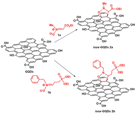 Here, we report for the first time the microwave-assisted 1,3-dipolar cycloaddition (1,3-DCA) of two nitrones: C-ethoxycarbonyl N-methyl nitrone 1a and the newly synthesized C-diethoxyphosphorylpropilidene N-benzyl nitrone 1b—with the graphene surface of GQDs affording eco-friendly and mild reaction conditions, the isoxazolidine cycloadducts isox-GQDs 2a and isox-GQDs 2b (Figure 1). Nitrone 1a was chosen for its known high reactivity towards different dipolarophiles [31], in order to test its reactivity with nano-scaled dipolarophiles and for the presence of the further functionalizable carboxyethyl group. Nitrone 1b was also investigated for synthetic purposes, as it possess a phosphonate group, suitable for the further anchorage with nucleic acids, for gene delivery applications.