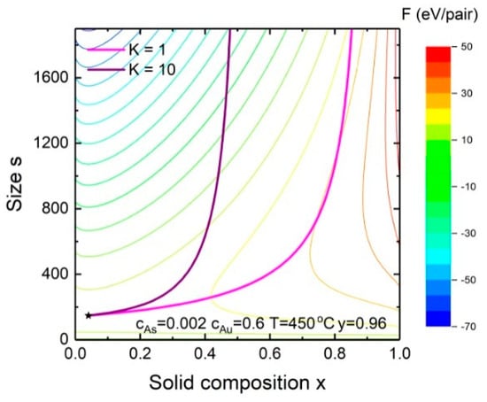 Next, we analyze the dependence of the solid composition on the nucleus/monolayer size for Au-catalyzed InxGa1−xAs NWs. Figure 4 shows the evolution of the solid composition during the vapor-liquid-solid growth of InxGa1−xAs NWs at fixed °C, , and for different . We do not consider the composition of subcritical nuclei because of their instability and start with the solid composition and size of the critical nucleus. Its position is defined by a saddle point (the star in the lower left corner of Figure 4) where the formation energy (color levels) is at minimum size and maximum composition. After the critical nucleus is formed, the incorporation rates of both species are described by Equations (1) and (2). The solid composition starts to tend to the kinetic composition, “forgetting” its nucleation-limited composition. At a large enough size (~2500) it almost reaches its stable value which is the steady-state composition. Of course, the solid composition might not reach the steady-state composition if a NW radius is very small and the critical size is large. However, according to our estimations, the contribution of nucleation-limited composition in the composition of InxGa1−xAs NWs is approximately 5% (: , for nm) under regular MBE and MOCVD conditions. For ternary solid solutions with a high value of the pseudobinary interaction parameter, it might be higher, leading to a significant modification of the final solid-liquid dependence.