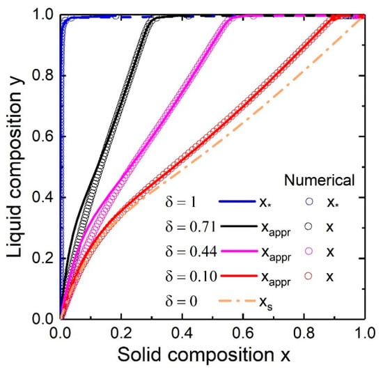 Because of the presence of the term where and are -dependent, integration of Equation (9) can only be performed using numerical methods. Anyway, irrespective of its initial value, the solid composition will tend to a stable steady-state value defined by Equation (8). However, one may assume -independence of and during the integration or at least its weaker influence on the final result than that of . This approximation is better the smaller is. Then integration of Equation (9) with the initial condition with being the critical nucleus size gives