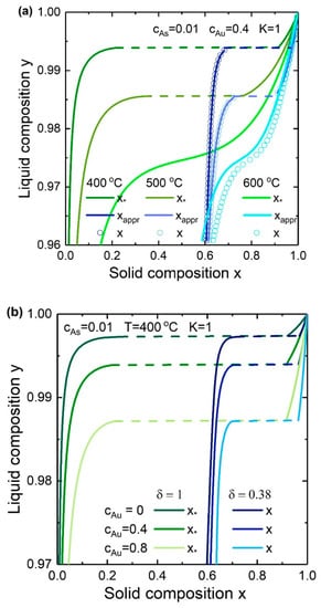 The liquid-solid composition dependences for InxGa1−xAs NWs at °C, and and at different As concentrations are presented in Figure 3. As it is seen, is highly dependent on the As concentration. This is in contradiction to the nucleation-limited composition where the curve depends on the Au/III concentration ratio and does not depend on the As concentration. The liquid-solid composition curve is similar to the nucleation limited composition dependence at small while the shape of the curve loses its steep behavior with the increase of the As concentration. At relatively high As concentration becomes more and more linear and approaches . This is due to the strong dependence of the supersaturation on the concentration of group V elements. Moreover, the miscibility gap width reduces with increasing As concentration. Comparing the curves calculated by Equations (8) and (20) proves that the usage of the simplified solution is appropriate at small solid compositions.