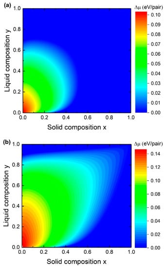 We start the discussion with the consideration of the steady-state composition. Values of the interaction parameters and the Gibbs energies used for calculations here and after are presented in one of our previous papers [30]. Figure 2 shows the liquid-solid composition dependences and the contour plots of chemical potential differences between the species AD (a) and BD (b) in the liquid phase and the solid phase at °C, , and . As can be seen, the curve follows the lines of at small and at high . It can be explained by the fact that in Equation (8) is satisfied if which means that . On the other hand, is satisfied if which means that .