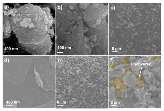 Figure 2 shows the SEM images of the SnO2 NP, MoS2 NS, and SnO2 anode covered with the MoS2 NS layer. To prepare the SnO2 NPs, an easy hydrothermal method was selected to obtain a uniform and highly crystalline material [40,41,42]. Sn(OH)x precipitation using NH4OH solution and hydrothermal processing were applied to develop the crystalline structures of the SnO2 NPs. It was observed that the size of the NPs was <100 nm. However, the detailed size distribution of the NPs cannot be determined by SEM measurement, as illustrated in Figure 2a,b. The diameters of the SnO2 NPs are discussed later via TEM analyses. Meanwhile, the MoS2 NSs were well prepared with lateral sizes ranging from a few hundred nanometers to a few micrometers, as shown in Figure 2c,d. The size of the NSs is larger than that of MoS2 fabricated by ultrasonication or ball milling [43,44]. The low-magnification SEM image shows that the MoS2 NSs uniformly cover the Cu electrode. Figure 2e,f shows a single-layer MoS2 NS thin film on the surface of the SnO2 electrode. It was calculated that the MoS2 NSs covered approximately 80% of the SnO2 electrode surface. The semi-transparent yellow indicates the uncovered electrode surface (Figure 2f), while the dark colors indicate the thin MoS2 layer covering the surface. From analysis of the SEM images, a novel SnO2 electrode uniformly covered with MoS2 NSs layers was prepared, from which better electrochemical performance is expected, compared to that of a pure SnO2 electrode.