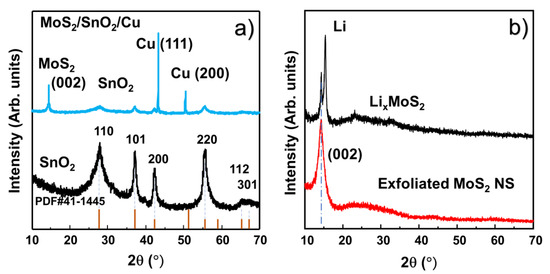 where λ is the X-ray wavelength of the XRD measurement, θ is the Bragg angle, and β is the full width at half maximum of the peak. Based on this information, the calculated crystal size of the SnO2 NPs was ~2–5 nm. The structure of the assembled MoS2 layer on SnO2 anode was also analyzed by XRD as shown in Figure 3a. The peaks of MoS2 NS, SnO2 and Cu were clearly revealed, indicating successful coverage of MoS2 on the SnO2 anode. Figure 3b shows the XRD patterns of LixMoS2 and the MoS2 NSs. The intercalation of lithium in the interface of each layer MoS2 introduced a peak at ~15.4°. After exfoliation in DI water, only the peak of (002) MoS2 remained, indicating the 2D structure of the MoS2 NSs. The size of MoS2 based on the (002) plane was calculated to be ~1 nm, illustrating the formation of thin and single- or few-layered MoS2 NSs [37,38]. The nanoscale sizes of the SnO2 NPs are promising for achieving the critical size of SnO2 that yields the best electrochemical performance. Moreover, high-quality single- and few-layer MoS2 with large lateral sizes effectively cover the electrode surface.