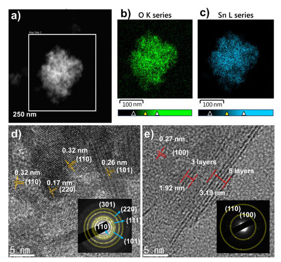 To further confirm the sizes and structures of the SnO2 NPs, the SnO2 powder was observed by TEM. Figure 4a–c shows the SnO2 EDS mapping images, where clear contrasts indicating Sn and O atoms were detected, indicating the high purity of the synthesized materials. In addition, the high-resolution TEM (HRTEM) image (Figure 4d) clearly shows the lattices of SnO2 NPs with (101), (110), and (220) planes with sizes of ~5 nm. This result agrees well with the calculation of the SnO2 crystal size from the XRD patterns. Furthermore, the selected-area electron diffraction (SAED) pattern in Figure 4d also confirms the lattice planes from the crystal structures, as marked with semi-transparent yellow circles. No other elements were found as contaminants. Therefore, pure SnO2 NPs were well prepared with a diameter of ~5 nm, which would contribute to a high performance in LIBs. Meanwhile, the morphology of MoS2 NS was also confirmed by HRTEM (Figure 4e), where a lattice spacing of 0.27 nm can be assigned to (100) plane. The spacing between lattice fringes in HRTEM image were to be 1.92 and 3.19 nm for 3 and 5 layers of MoS2, respectively. Furthermore, the SAED as an inset of Figure 4e also confirmed the high crystallinity of the MoS2 layer. Therefore, it can be considered that the MoS2 NS was successfully exfoliated to single- and few-layer MoS2.