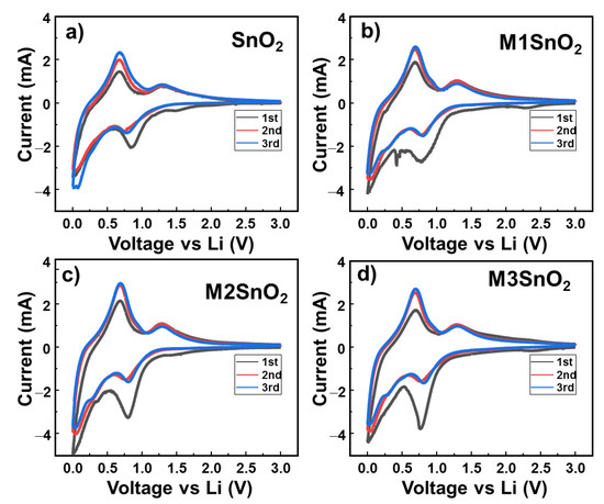 Cyclic voltammetry (CV) profiles of (a) SnO2 NS and (b–d) M1/M2/M3SnO2 anodes over three cycles.